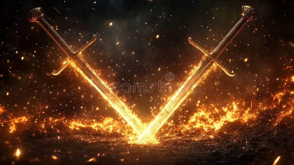 with swords of fire fully drawn!